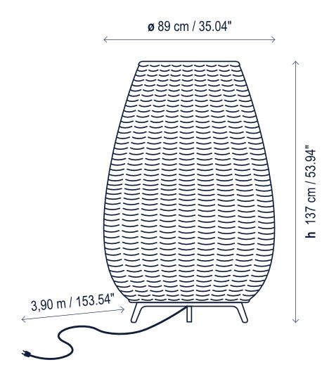 Stehleuchte für den Innen- und Aussenbereich; die Lichtquelle befindet sich in einer wasserdichten Polyehtylen-Ellipse.