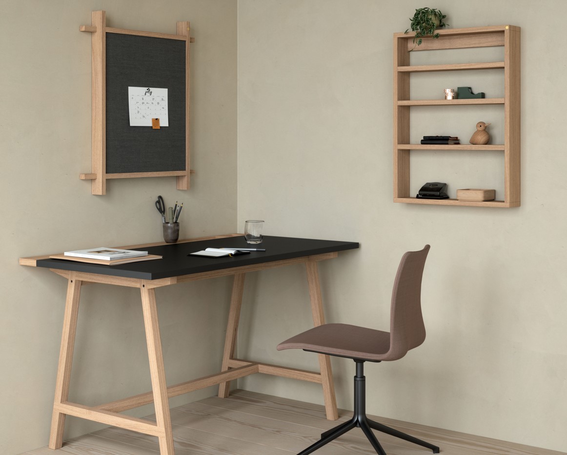 Das A-Podium Regal wurde von Charlotte Høncke entworfen, und das schlichte Design macht Platz für die einfache Konstruktion, die klare Qualität und den ehrlichen Ausdruck des Regals, der sich überall in der Wohnung widerspiegelt, wo das Regal aufgehängt wird.