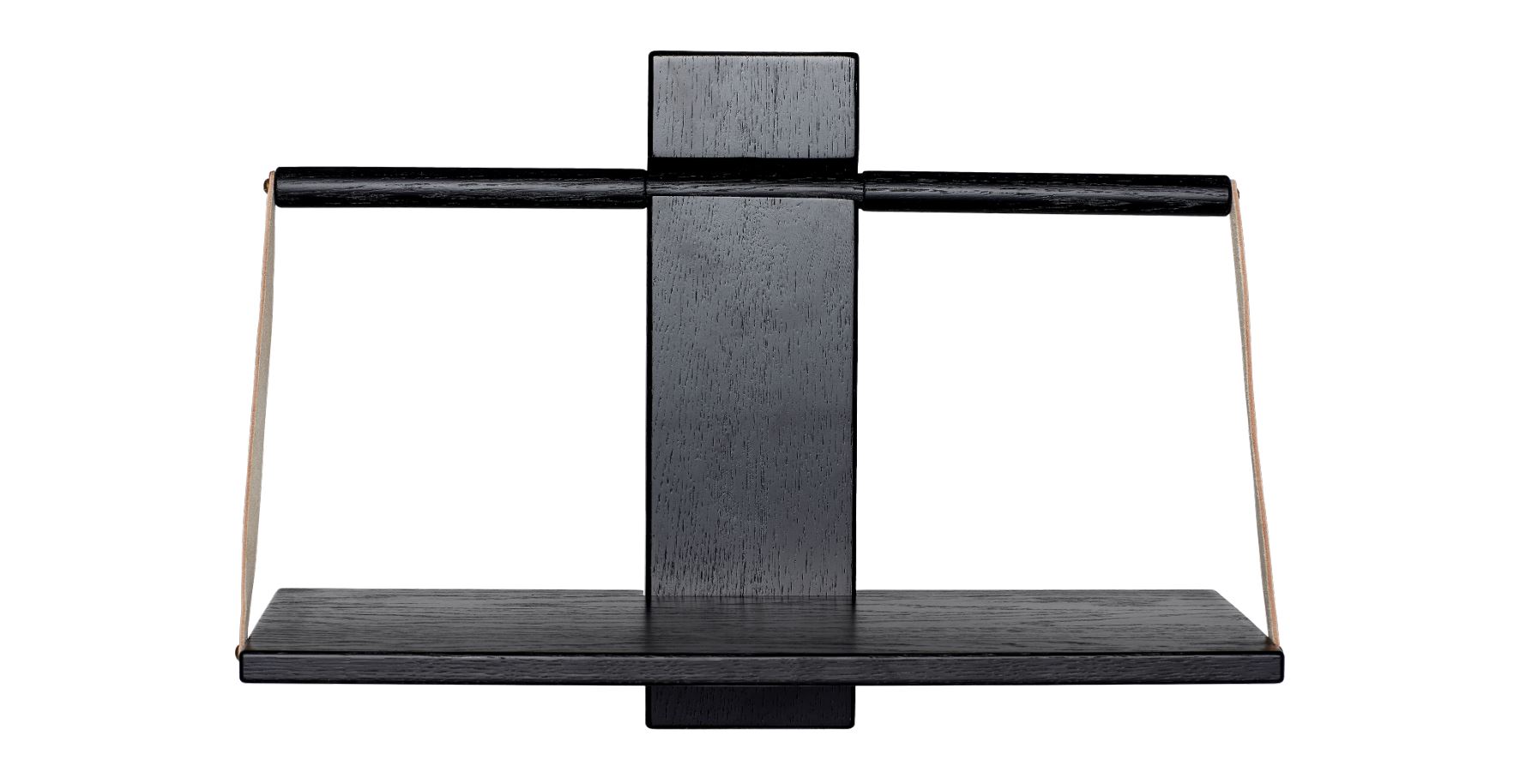 Wood Wall lässt sich leicht auf der Wand montieren. Der Wandregal ist aus massiver Eichenholz gefertigt, und die Riemen bestehen aus echtem Kernleder.