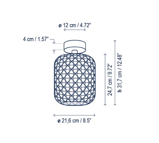 Masse: Ø 21.6 cm H 24.7 cm, siehe MasszeichnungMaterial: Aluminium, Eisen und Synthetic Faser