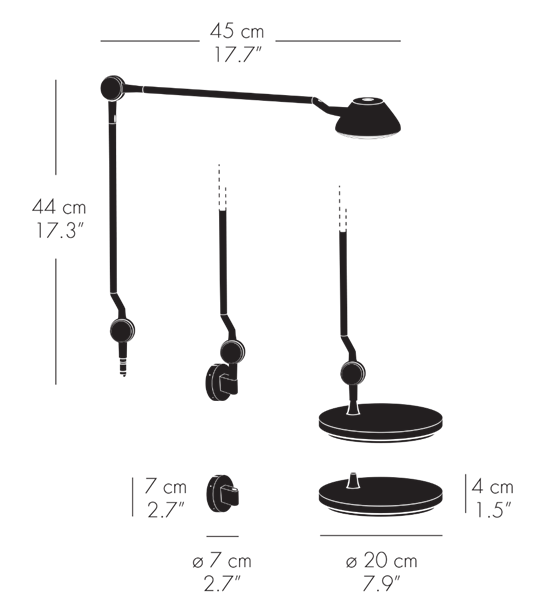 Die zarten Arme, die die Gelenke verbinden, verbergen den Draht und halten ihn mit einer Feder in Position, damit das elegante Äussere der Lampe frei von überflüssigen Elementen bleibt.