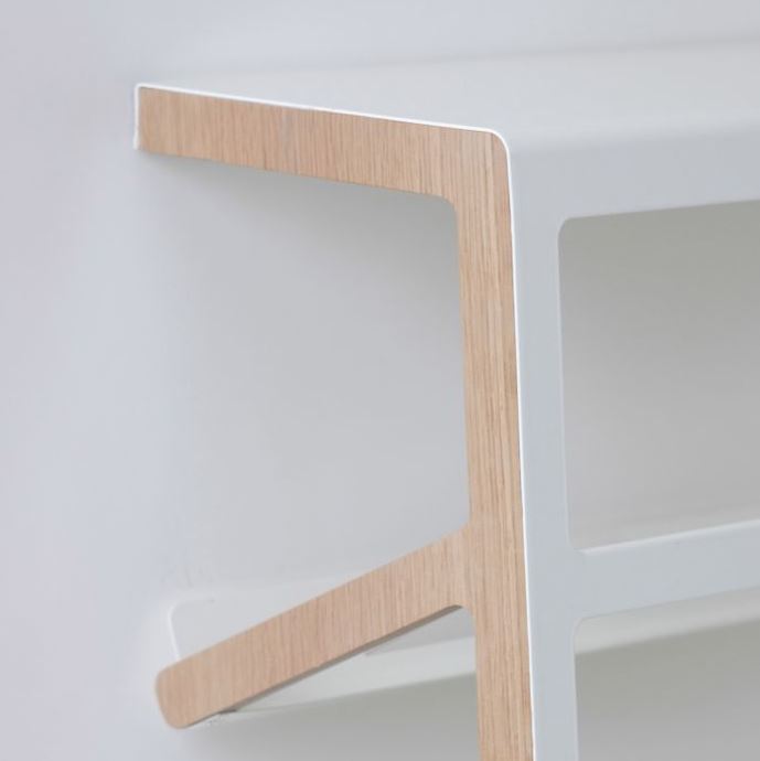 Front und Tablare aus Stahlblech, pulverbeschichtet weiss glanz, Seitenteile aus Schichtholz mit Deckfurnier in Eiche gebleicht (USA)