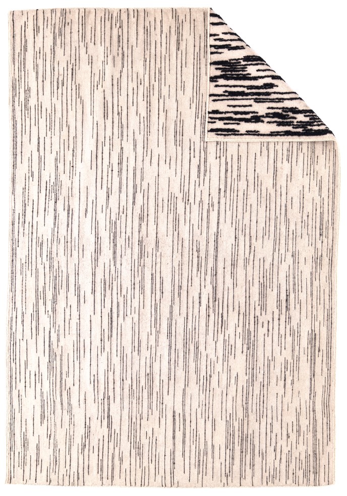 Doblecara, entworfen von Ronan Bouroullec, spiegelt seinen Geist der Geometrie durch subtile lineare und unterbrochene Striche wider, die in einem verschwommenen Punkt enden und im Auge des Betrachters ein Gefühl der Bewegung erzeugen.Doblecara 2 ist ein Wendeteppich, der von beiden Seiten genossen werden kann. Die "A"-Seite zeigt das Design mit der größten Persönlichkeit, bei dem die strengen schwarzen Linien dank der verschiedenen Ebenen zwischen den Techniken am besten zur Geltung kommen, während die "B"-Seite die subtilste und zarteste ist, bei der der raue Ton zusammen mit den weichen dunklen Strichen hervorsticht.