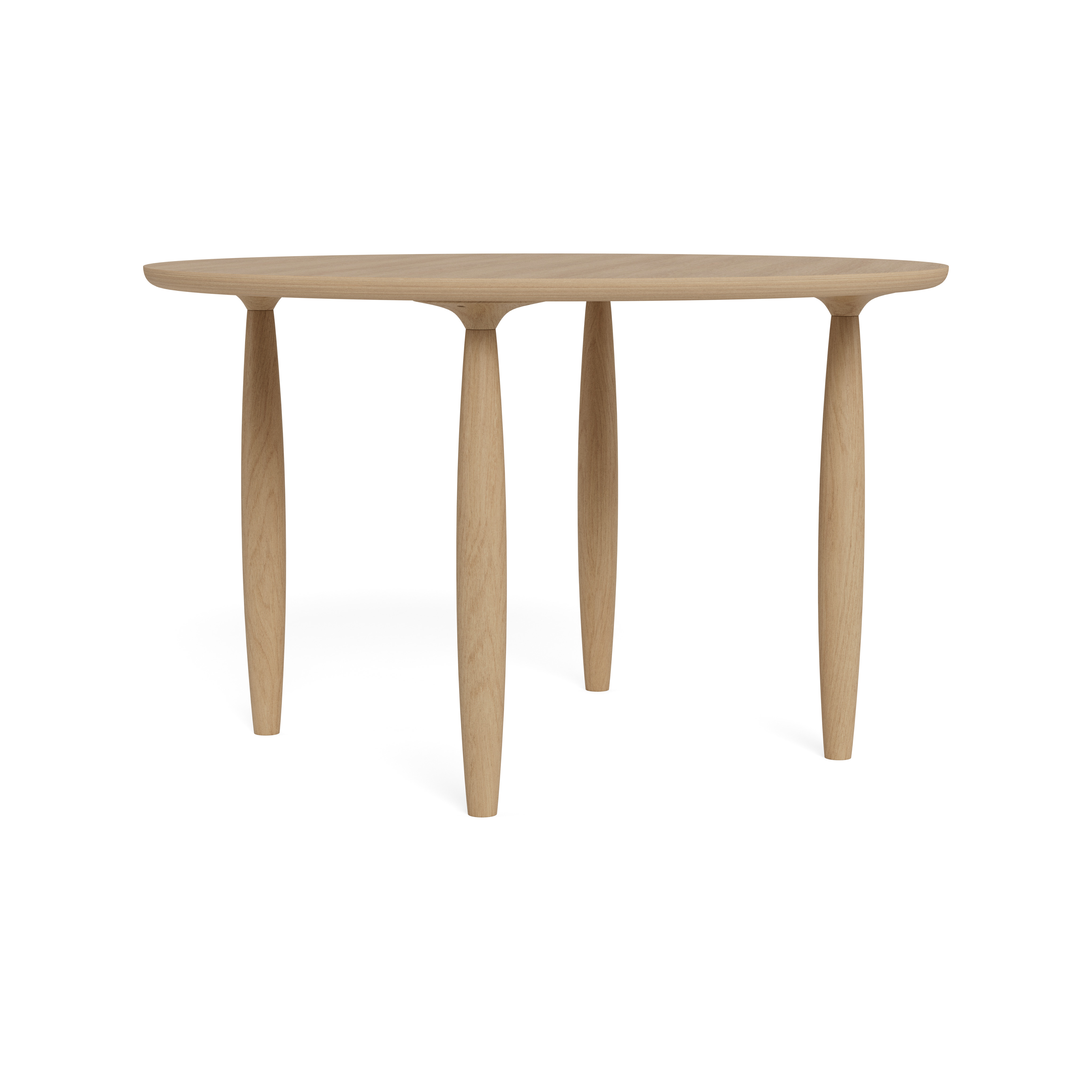 Oku ist eine Interpretation des japanischen Wortes für Eiche „Ōku“. Oku bezieht sich auf die Essenz des Designs - Eiche. Durch Experimente mit dem Gleichgewicht zwischen Leichtigkeit und Schwere, die den Tisch aus einem Blickwinkel hauchdünn und aus einem anderen massiv erscheinen lassen, unterstreicht das Design das natürliche Material. Die Tischplatte von Oku ist aus Eichenfurnier mit abgerundeten Kanten gefertigt, was der großen Oberfläche ein raffiniertes Detail verleiht. Die Beine aus gedrechselten Eichenholzprofilen sind sporadisch angeordnet, um die Illusion einer schwebenden Tischplatte zu erzeugen und dem Tisch gleichzeitig ein skulpturales Detail zu verleihen. Oku ist sowohl in rechteckiger als auch in runder Form erhältlich und eignet sich aufgrund der verschiedenen Größenoptionen sowohl für Privathäuser als auch für Büros.