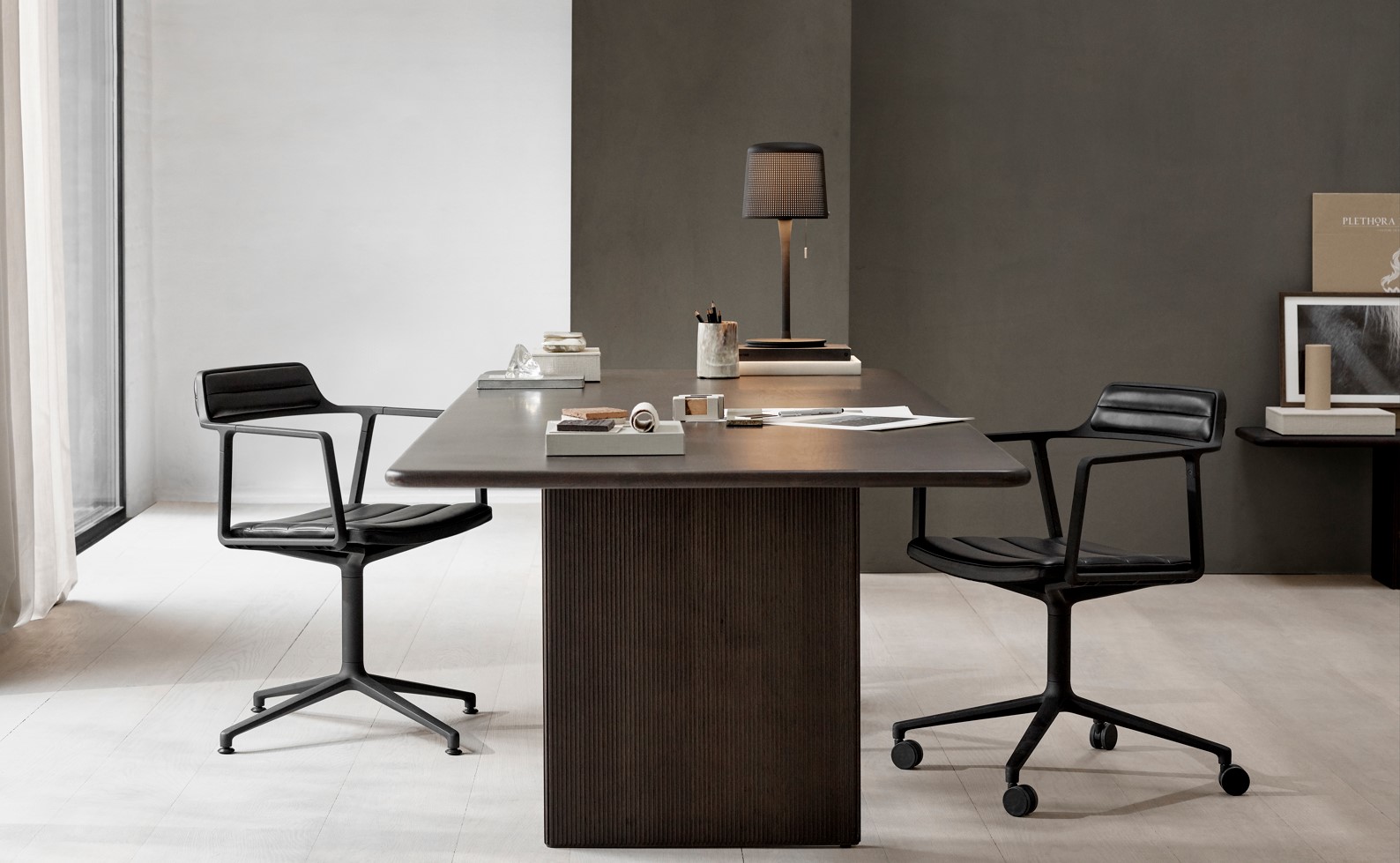 Der mit fester Höhenposition und diskret gesticktem Polstermuster entwickelte Stuhl lädt zum komfortablen und vielseitigen Sitzen ein.